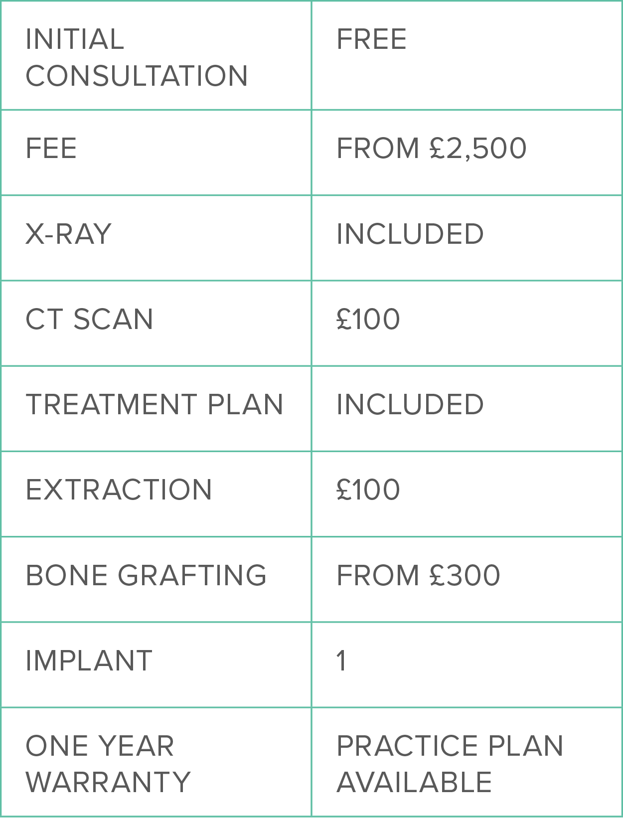 To find out more about the costs of a single implant, please take a look at the table below. Some of our patients don't require a CT scan or surgical extraction, so we only charge these add ons if necessary..